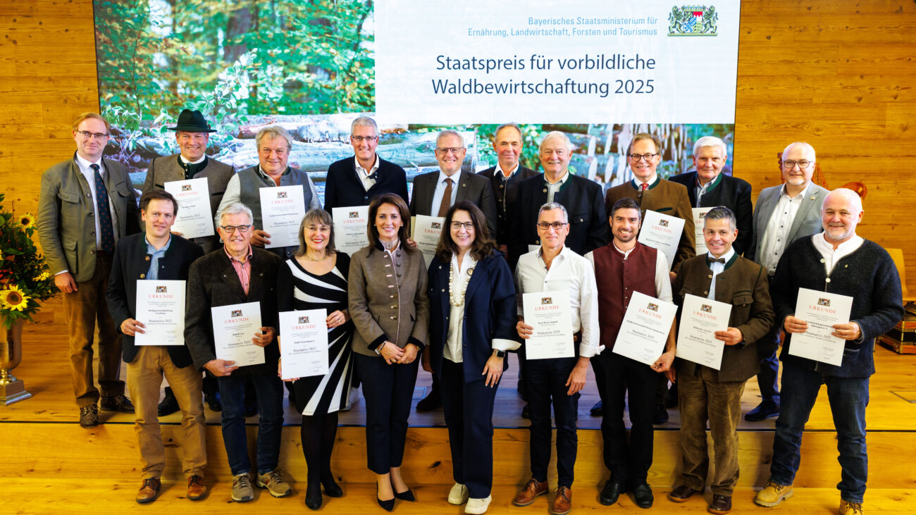 In Zeiten des Klimawandels ist vorbildliche Waldbewirtschaftung entscheidend für den Schutz und die nachhaltige Nutzung der Wälder. Außerdem garantiert sie das Erfüllen von Bedürfnissen der aktuellen Generation, ohne die Möglichkeiten künftiger Generationen zu beeinträchtigen. Nicht zuletzt aus diesem Grund hat Forstministerin Michaela Kaniber heute 15 Waldbesitzer aus ganz Bayern mit dem Staatspreis für vorbildliche Waldbewirtschaftung ausgezeichnet. Nach Worten der Ministerin sind die Preisträger wahre Vorbilder für alle Waldbesitzerinnen und Waldbesitzer. „Sie pflanzen klimatolerante Bäume, pflegen Zukunftswälder, setzten sich für waldverträgliche Wildbestände ein und vermarkten den klimafreundlichen Rohstoff Holz. Damit leisten Sie einen unverzichtbaren Beitrag für die grüne Lunge unserer Heimat und damit für alle Menschen in Bayern“, betonte die Ministerin beim Festakt in München. Weiter sagte sie: „Mit diesem Preis möchte ich Ihnen für Ihren jahrelangen unermüdlichen Einsatz, für ihren Fleiß und ihr Herzblut, das Sie in das Bewirtschaften Ihres Waldes haben fließen lassen, danken.“ Der mit einem Preisgeld von je 1.000 Euro dotierte Staatspreis wird seit 1997 alle zwei Jahre vergeben. Unter dem diesjährigen Motto „Wir brauchen den Wald – der Wald braucht uns“ wählte eine Jury aus Vertretern der Waldbesitzer-Verbände und der Forstverwaltung die Preisträger aus. Insgesamt waren 64 Vorschläge aus allen Regierungsbezirken eingereicht worden. Die Bayerische Forstverwaltung unterstützt private und kommunale Waldbesitzer mit kostenfreier Beratung, einem umfangreichen Angebot an Förderprogrammen und praxisgerechter Forschung. Allein im vergangenen Jahr konnten die Waldbesitzer mit Unterstützung des Freistaates gut zehn Millionen neue Zukunftsbäume pflanzen. Hinweis an die Redaktionen: Eine Liste der Preisträger sowie ein Foto sind beigefügt. Es ist unter Angabe von Matthias Balk/StMELF honorarfrei verwendbar. Das Bild zeigt Staatsministerin Michaela Kaniber im Rahmen der Feierlichkeit gemeinsam mit den Preisträgern des Staatspreises für vorbildliche Waldbewirtschaftung sowie weiteren Ehrengästen. Weitere Fotos der Preisverleihung können ab Donnerstag, 16. Oktober unter https://s.bayern.de/waldpreis heruntergeladen werden. Die Verwendung ist unter Angabe Matthias Balk/StMELF ebenfalls honorarfrei. Umfassende Informationen zu den Angeboten der Bayerischen Forstverwaltung finden Sie auch im Internet unter www.forst.bayern.de oder in unserem Waldbesitzerportal unter www.waldbesitzer-portal.bayern.de Liste der Staatspreisträger für vorbildliche Waldbewirtschaftung 2025 Name/Institution Ort Waldbesitz im Regierungsbezirk Landkreis Matthias Muth Valley Oberbayern Miesbach Jagdgenossenschaft Wonneberg Oberbayern Traunstein Familie Karl Mittelstetten-Längenmoos Oberbayern Fürstenfeldbruck Heiliggeistspitalstiftung Landshut Niederbayern Landshut Dorfgemeinschaft Rentpoldenreuth Perlesreut Niederbayern Freyung-Grafenau Hubertus von Eyb Ebermannsdorf Oberpfalz Amberg-Sulzbach Bürgerspitalstiftung Schwandorf Oberpfalz Schwandorf Heinrich Freiherr von Pölnitz Egloffstein Oberfranken Bamberg, Forchheim und Kronach Stadt Gunzenhausen Mittelfranken Weißenburg-Gunzenhausen Rudolf Loy Abenberg Mittelfranken Roth Karl-Heinz Amend Karlstadt-Wiesenfeld Unterfranken Main-Spessart Stiftung Juliusspital Würzburg Unterfranken Bad Kissingen und Main-Spessart Forstbetriebsgemeinschaft Kitzingen w. V. Iphofen Unterfranken Kitzingen Nutzungsrechtewald Sechspfarrwald Rieder Marktoberdorf Schwaben Ostallgäu Jagdgenossenschaft Weiler-Simmerberg Schwaben Lindau (Bodensee) Mit freundlichen Grüßen Pressereferat Pressereferat Bayerisches Staatsministerium für Ernährung, Landwirtschaft, Forsten und Tourismus Ludwigstraße 2 80539 München +49 (89) 2182-2215 +49 (89) 2182-2217 presse@stmelf.bayern.de